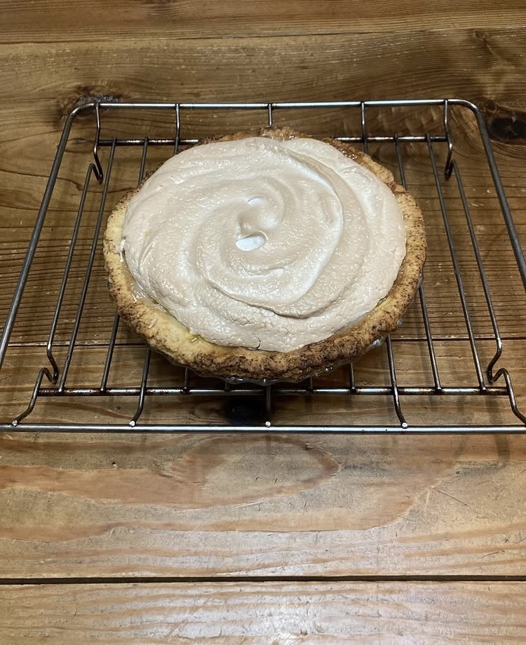 レモンパイは赤毛のアンに登場するお菓子です。カスタードにレモン果汁とレモンの皮を入れると、さっぱりとした、でも濃厚なクリームになります。それをパイ生地に流し込んでメレンゲをのせます。酸味と甘味がマッチして本当に美味しい(